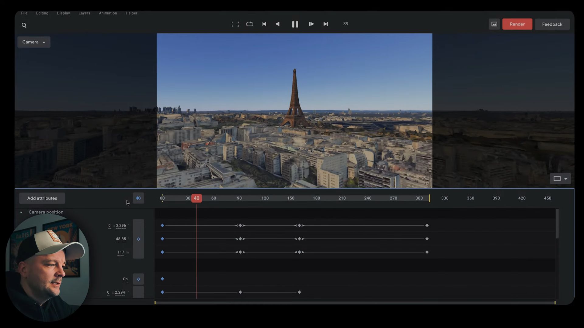 Ľudovít starts by choosing a location — in this case, Paris and the Eiffel Tower. He animates the camera in a way that resembles a blockbuster establishing shot: sweeping into the scene, framing it for impact. Features used here include: